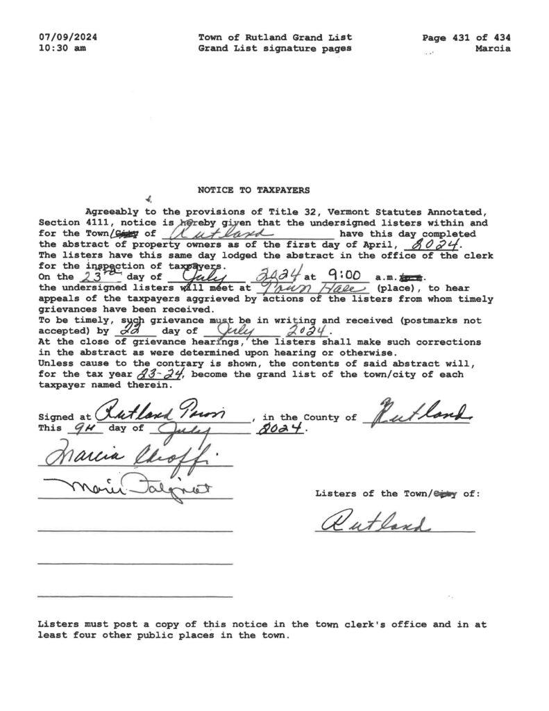 PLEASE TAKE NOTICE THAT THE TOWN OF RUTLAND LISTERS WILL BE HOLDING GRIEVANCES ON JULY 23RD, 2024.