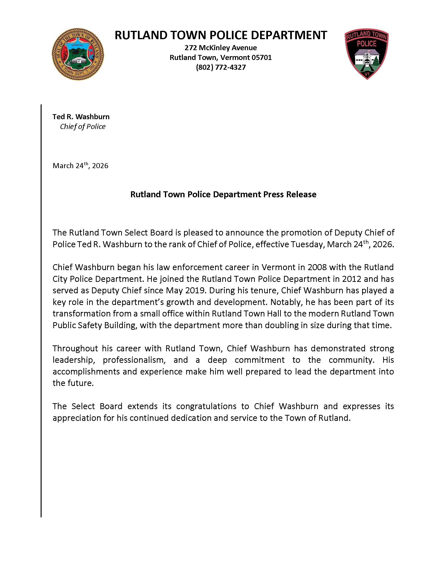 Press release – Promotion of Deputy Chief Washburn to Chief of Police