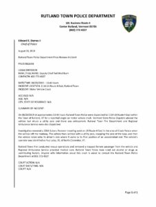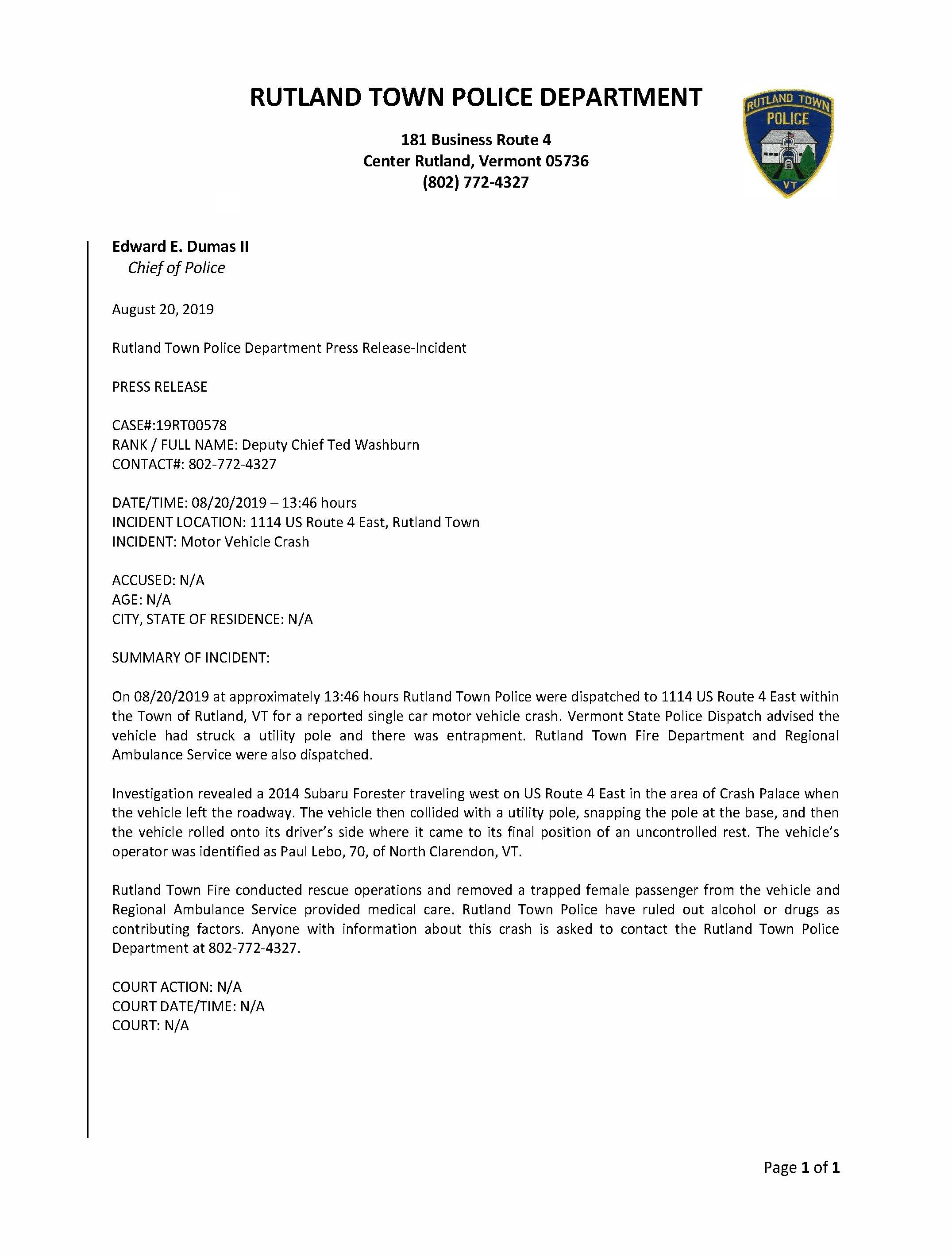 Rutland Town PD Press Release – Motor Vehicle Crash