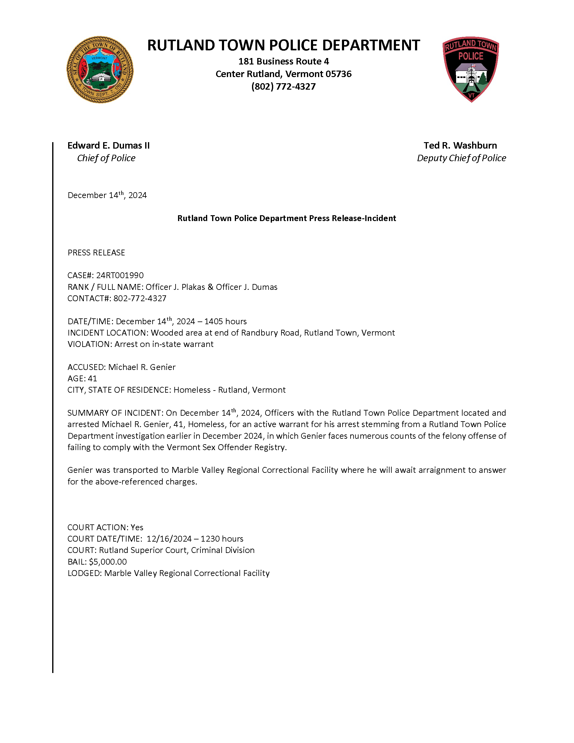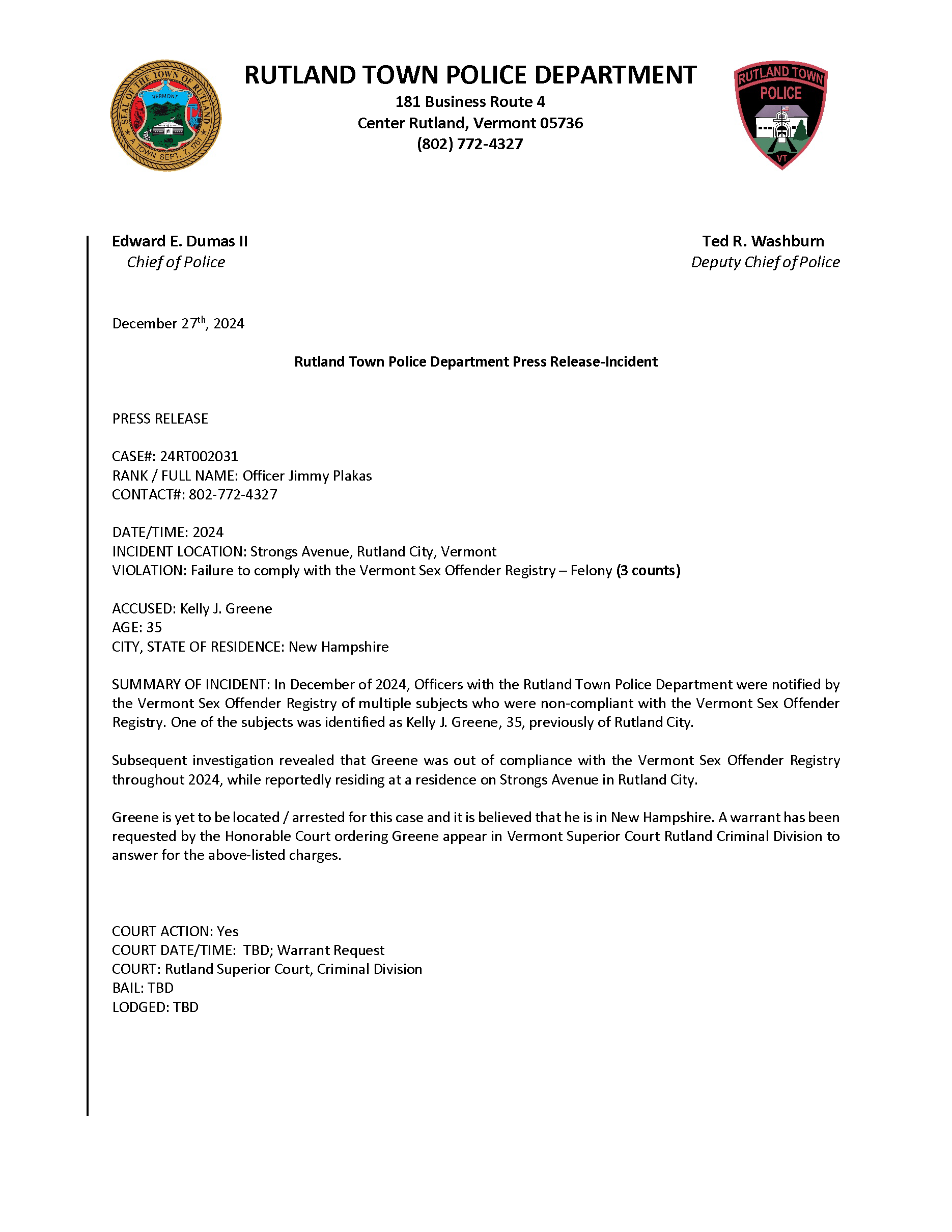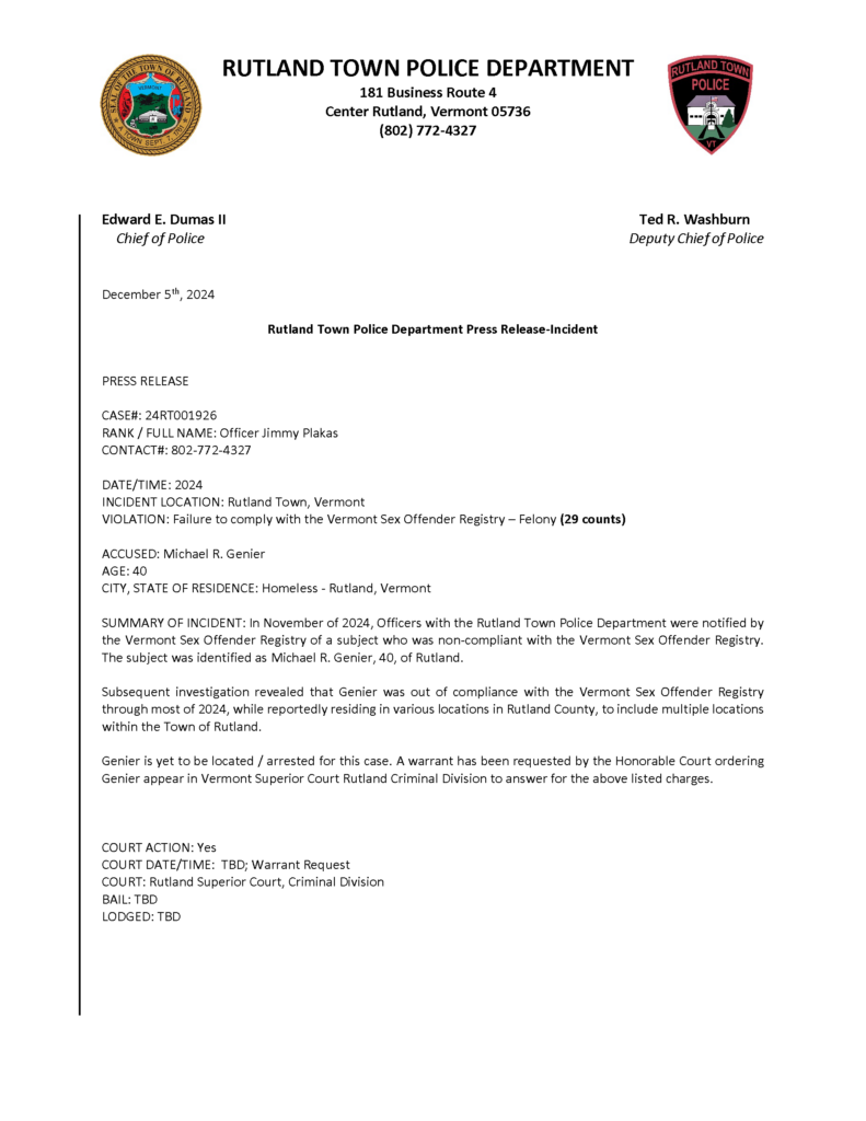 Rutland Town Police Department December 2024 Press Releases