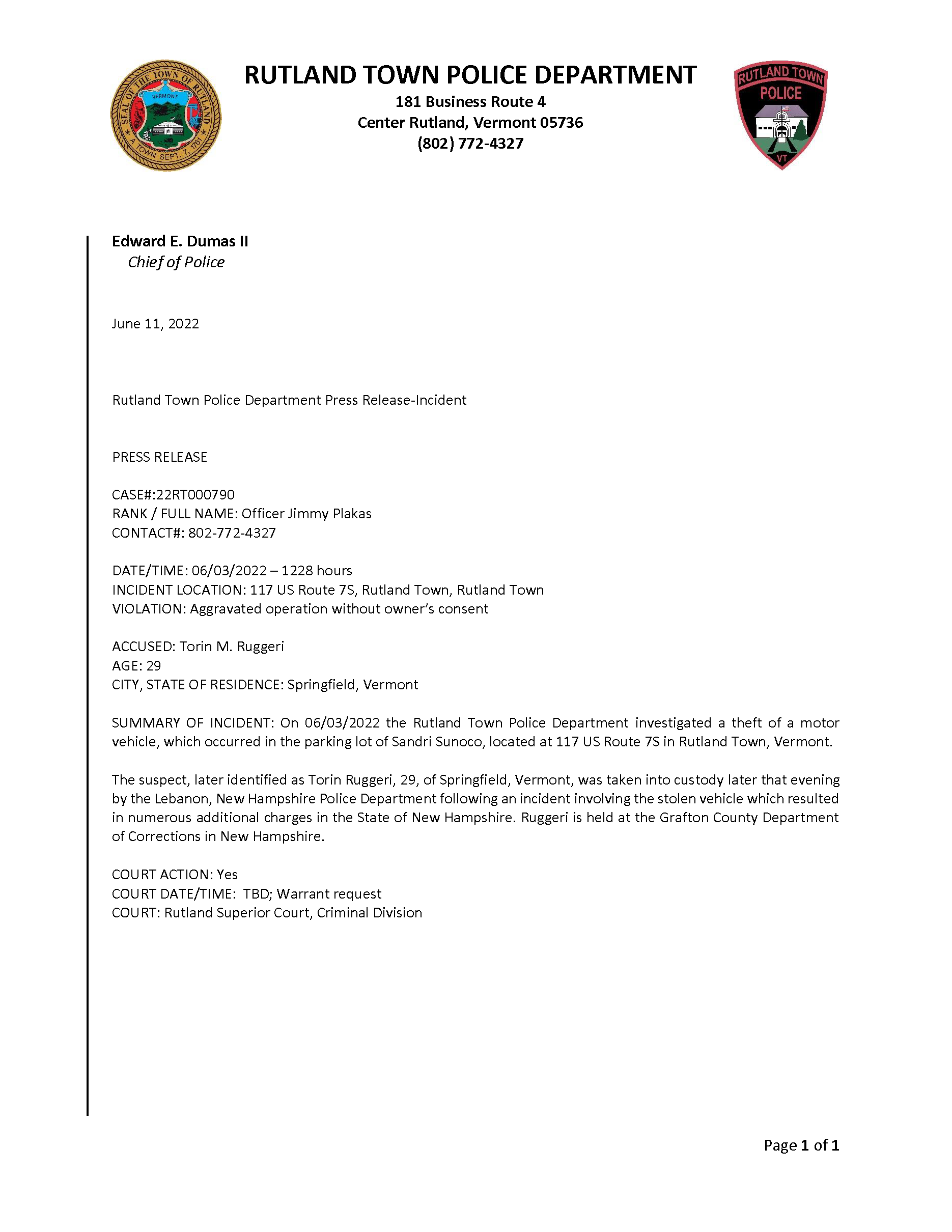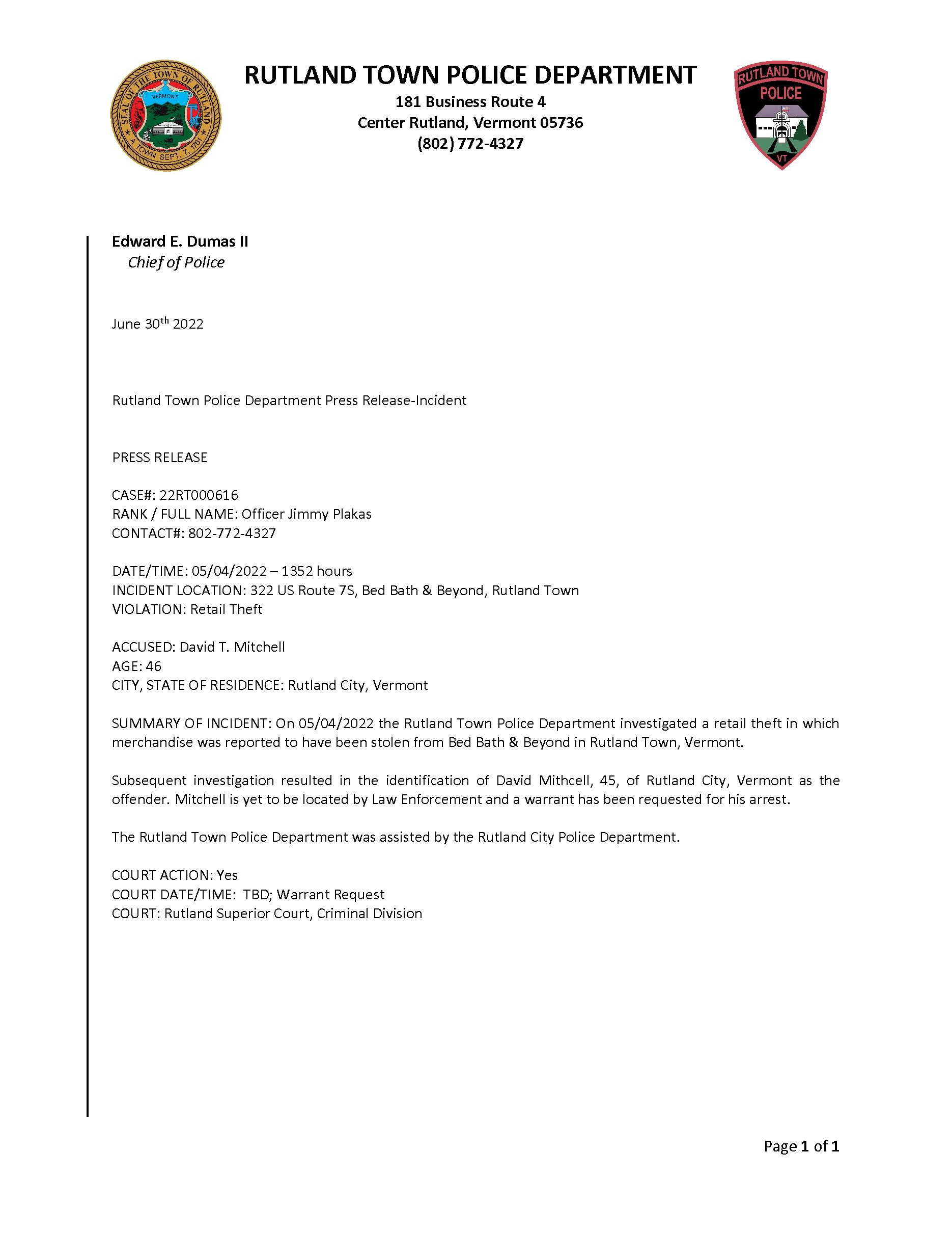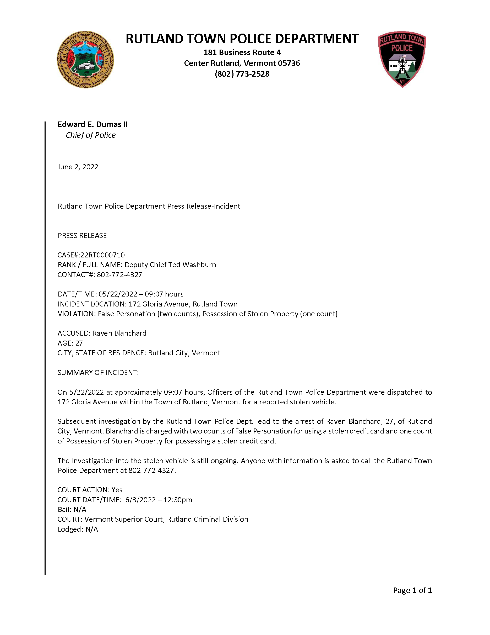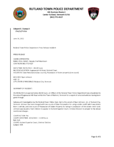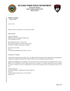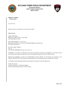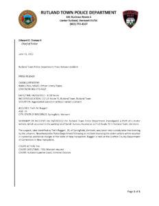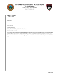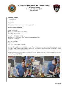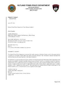 Rutland Town Police Department June 2022 Press Releasees