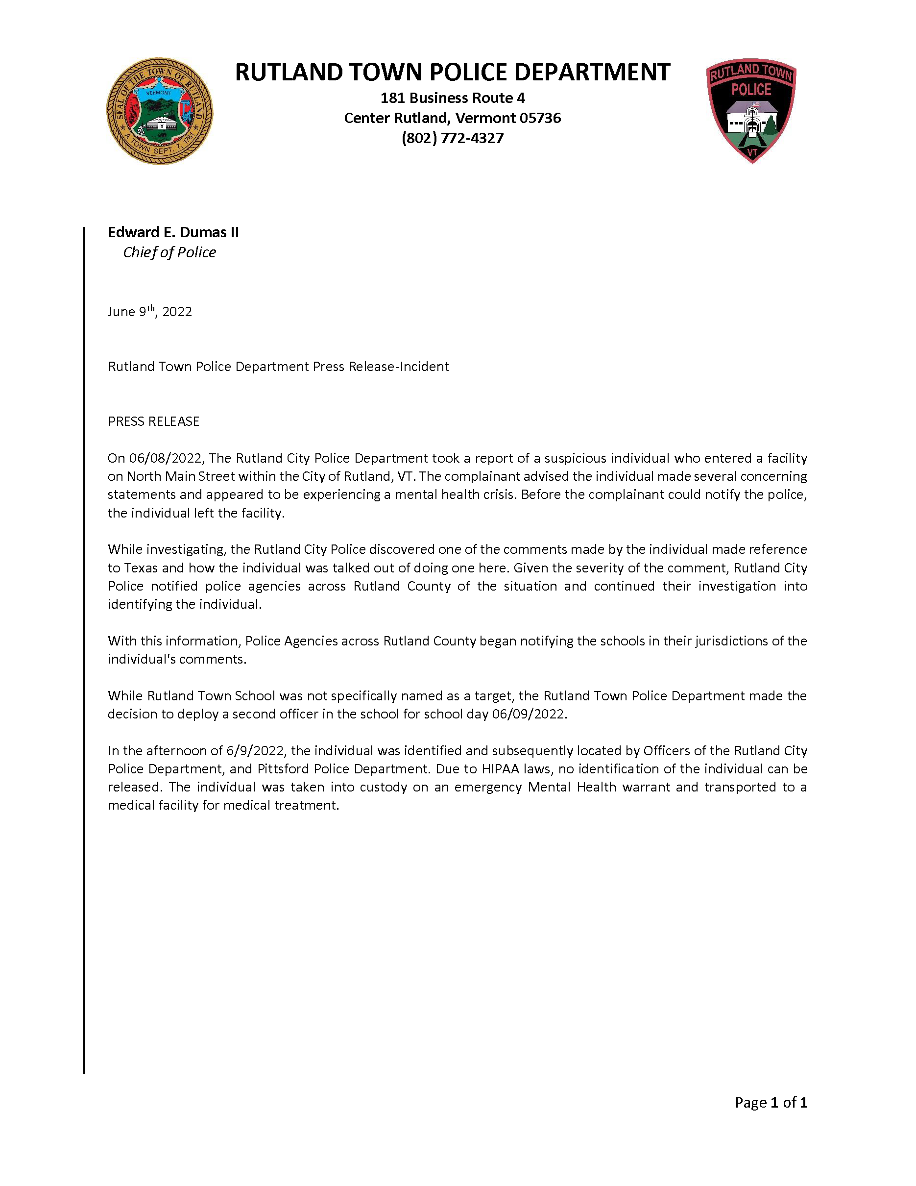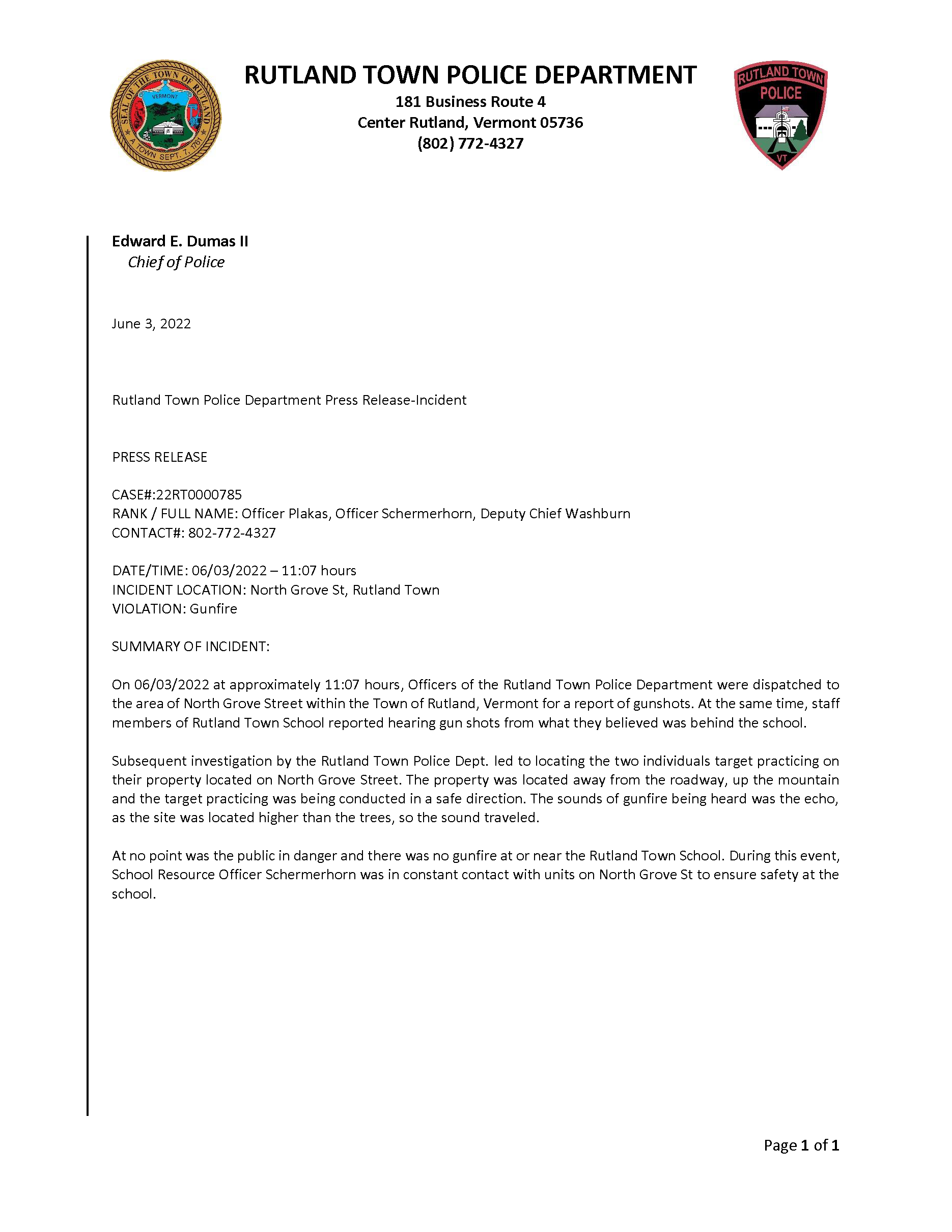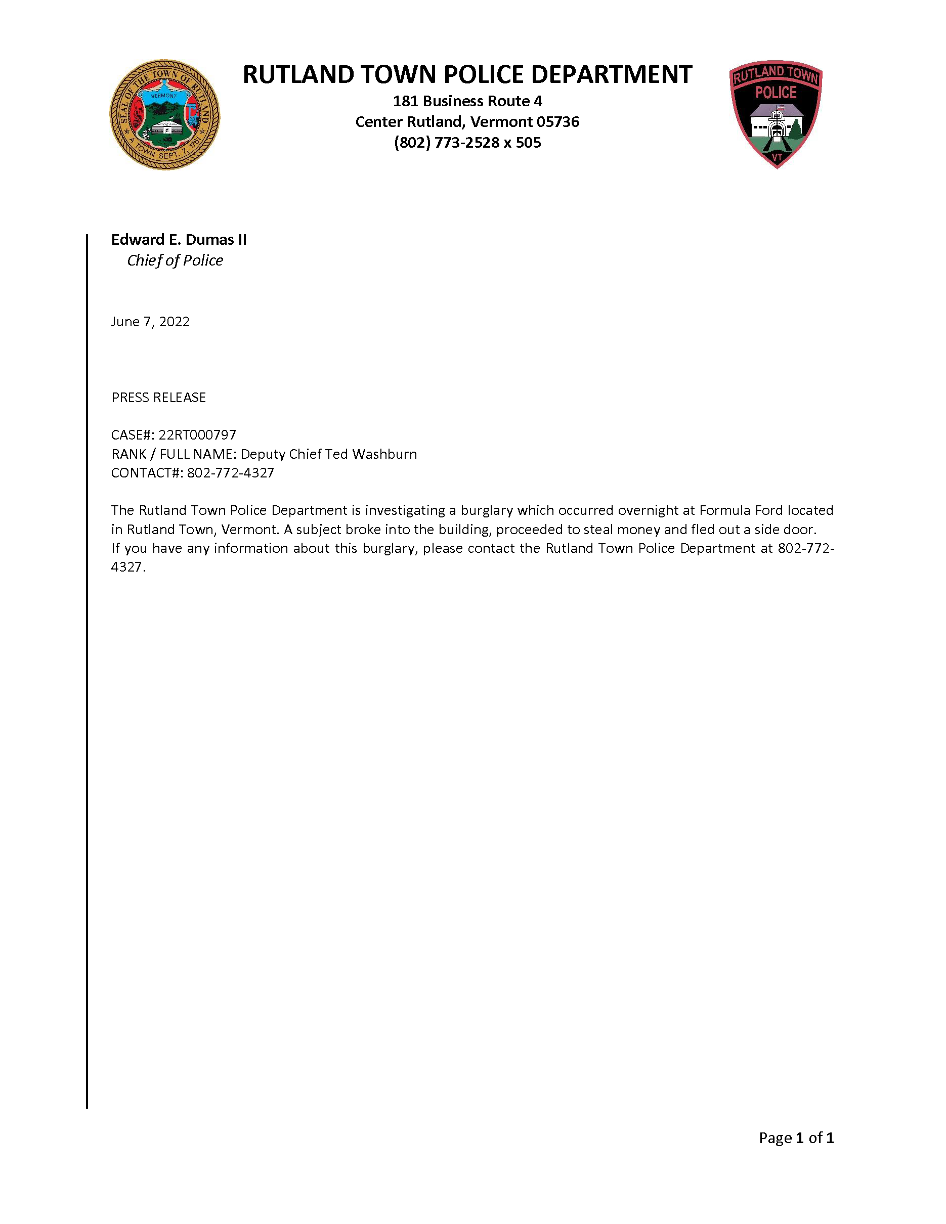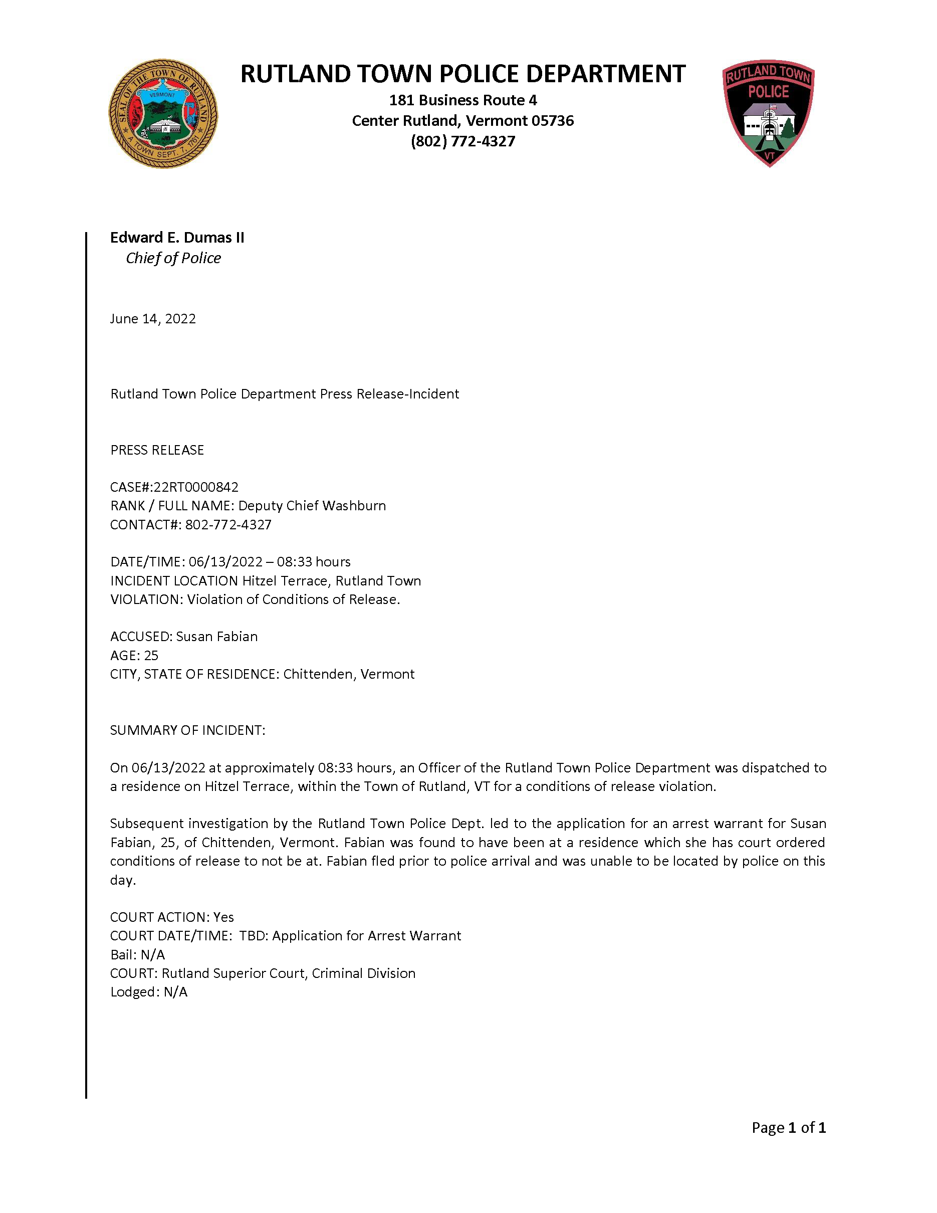 Rutland Town Police Department June 2022 Press Releasees