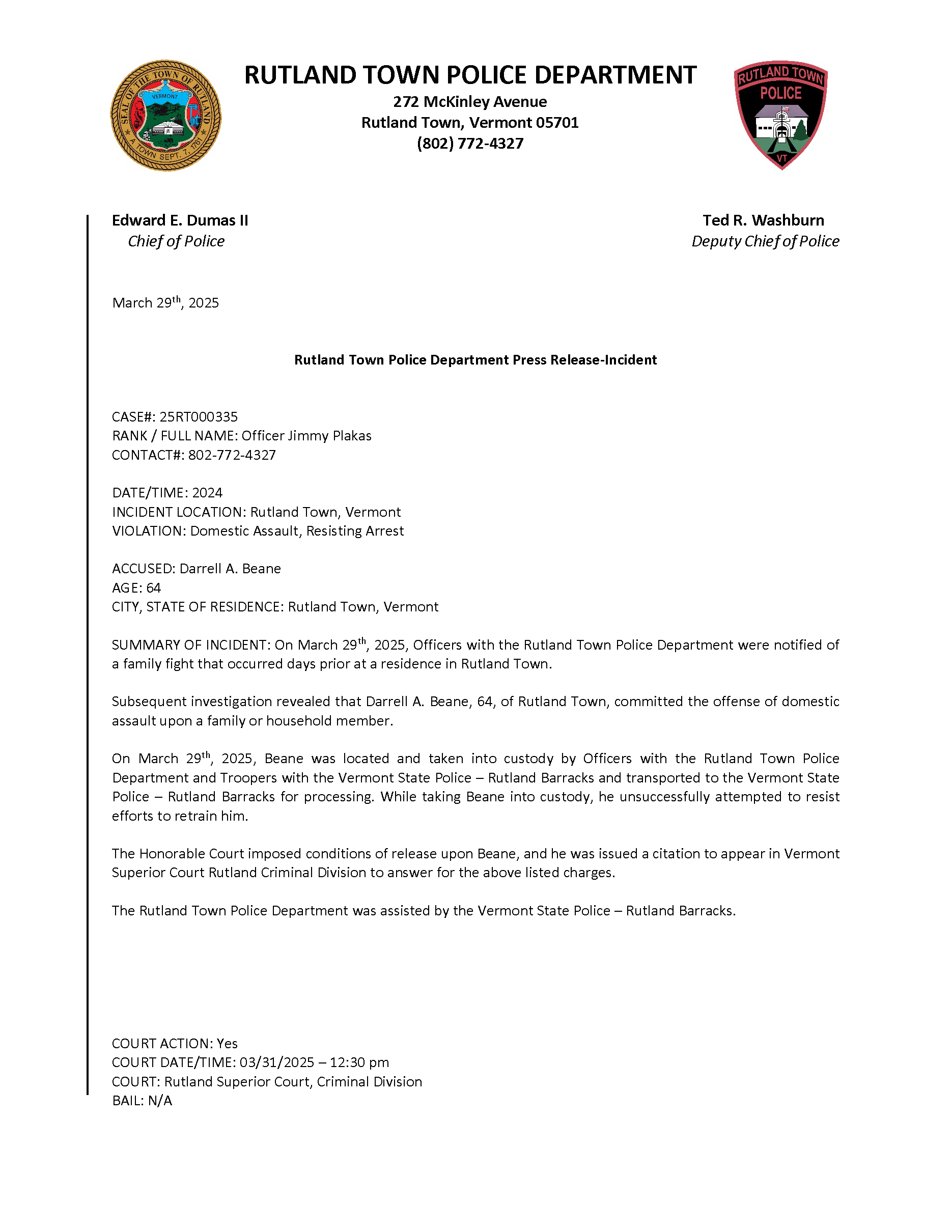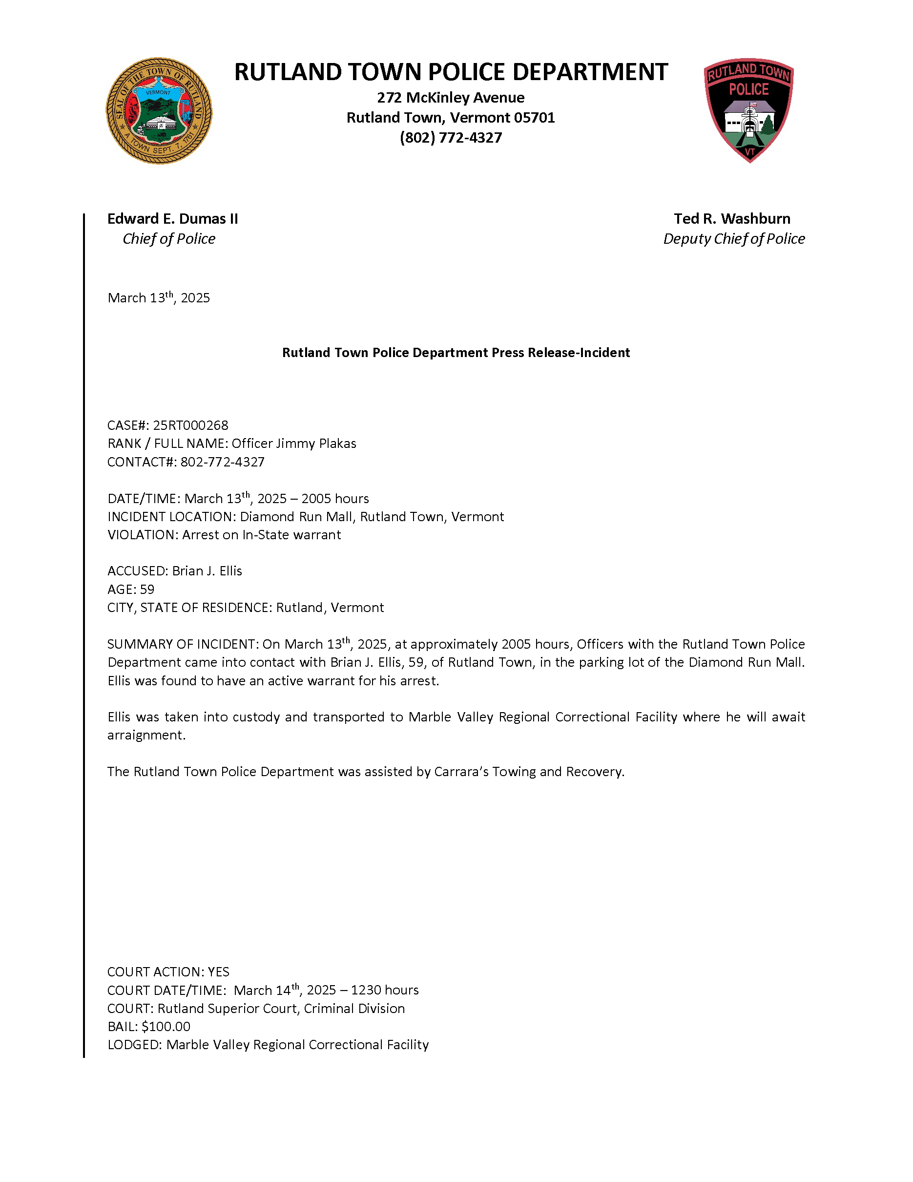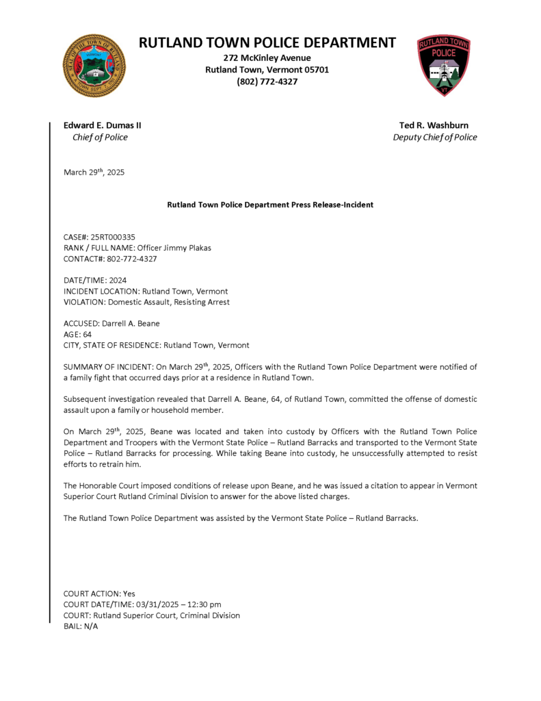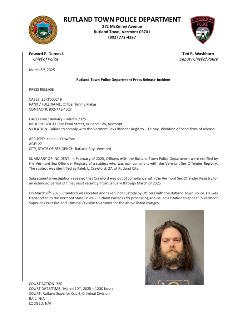 Rutland Town Police Department March 2025 Press Releases