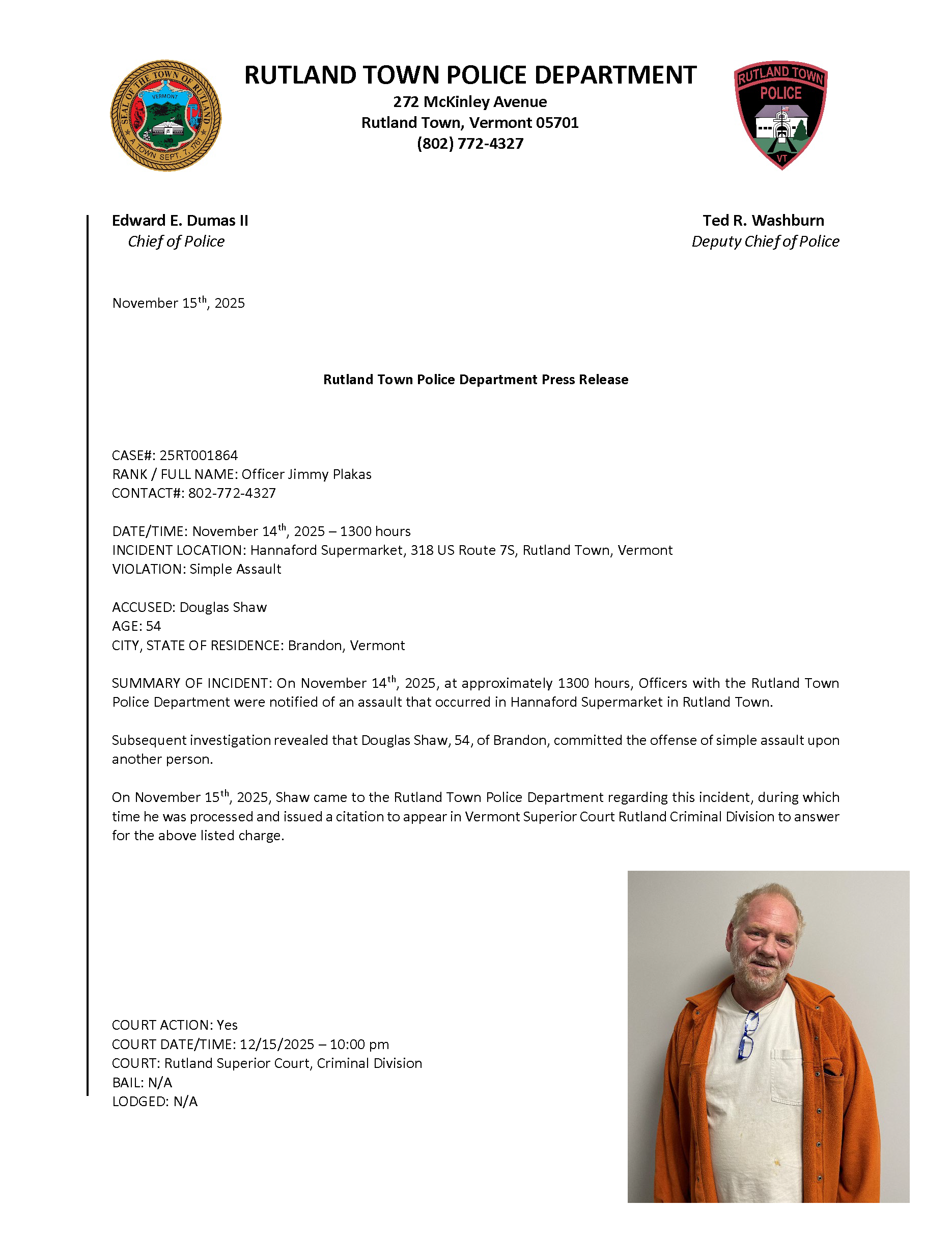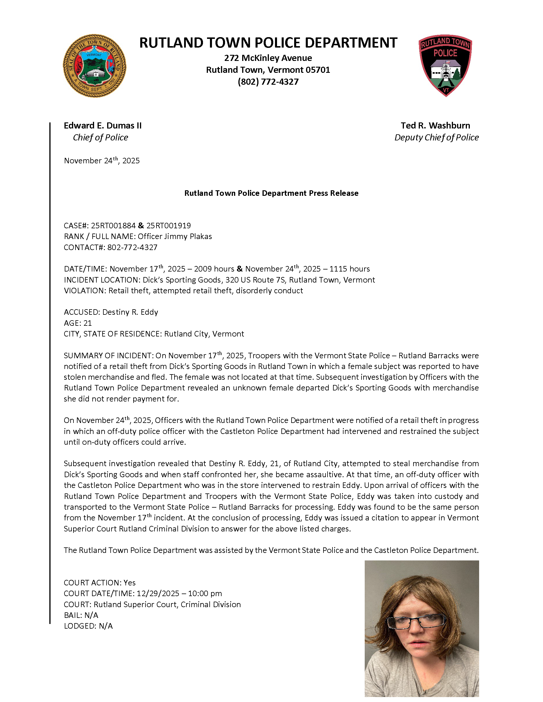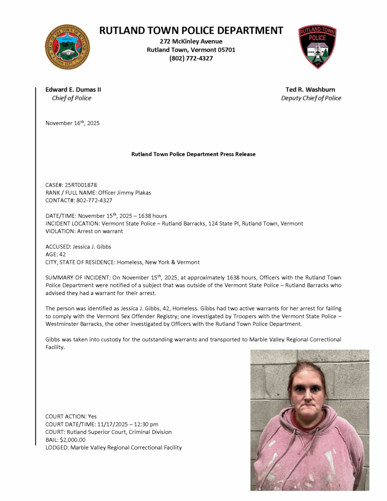 Rutland Town Police Department November 2025 Press Releases