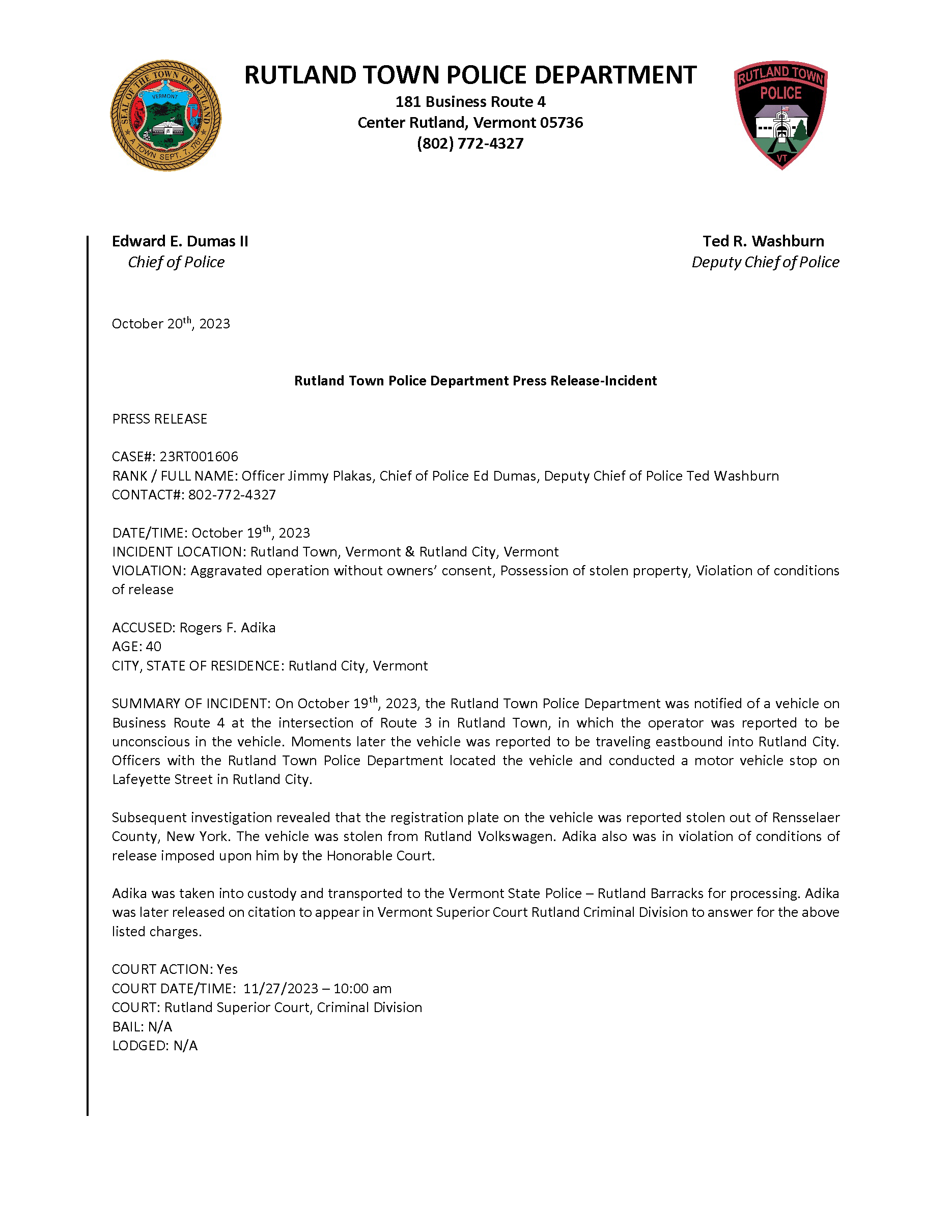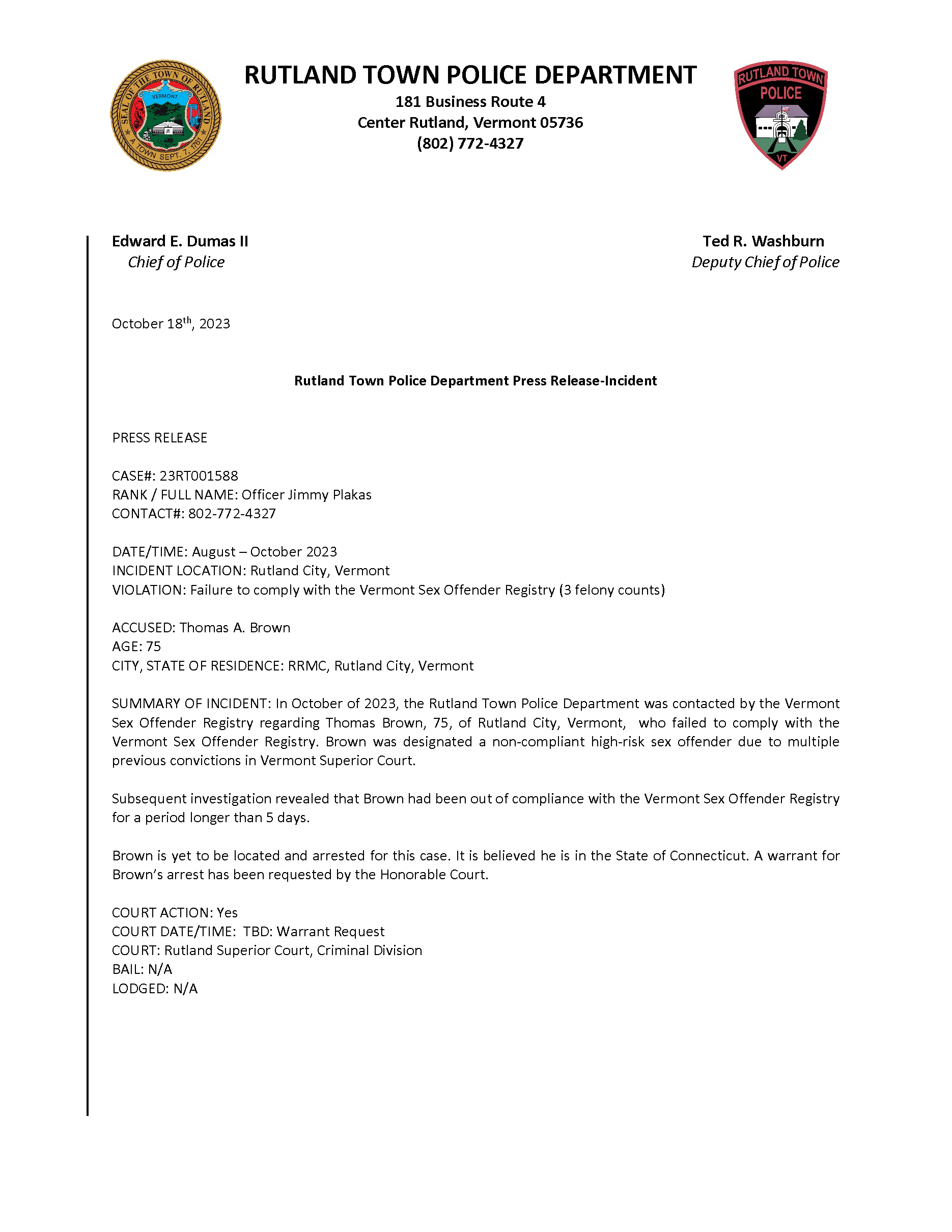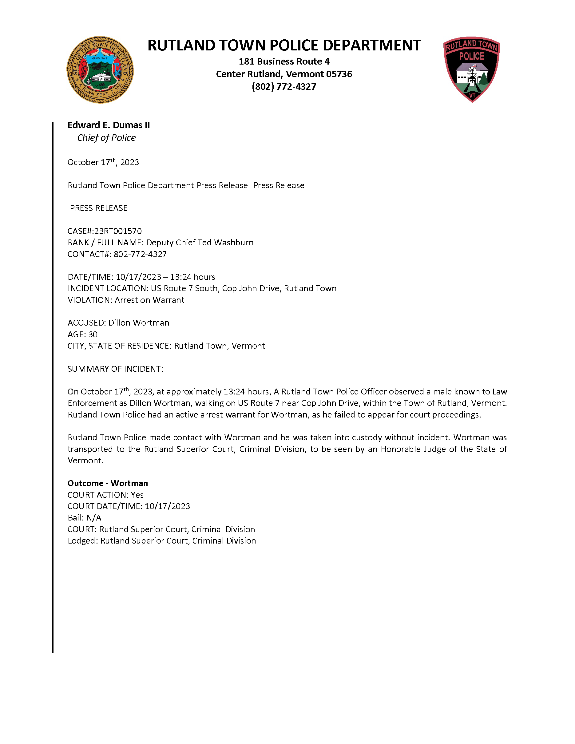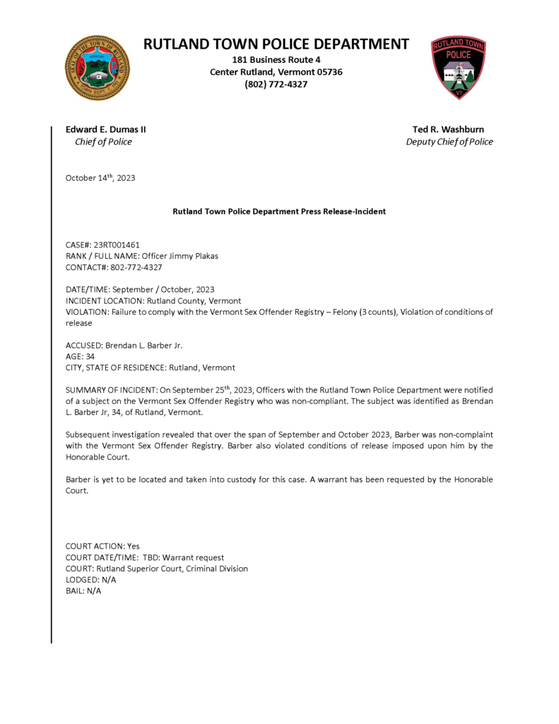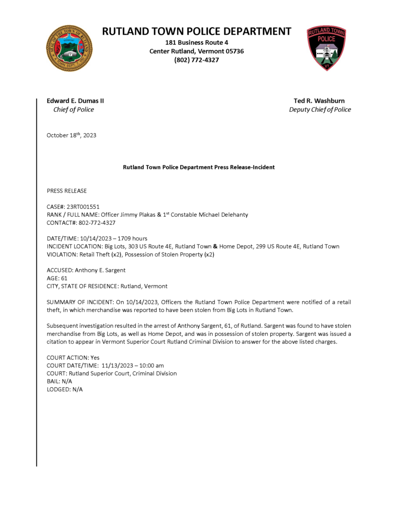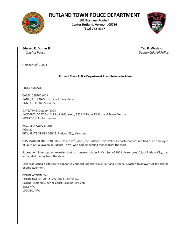 Rutland Town Police Department October 2023 Press Releases