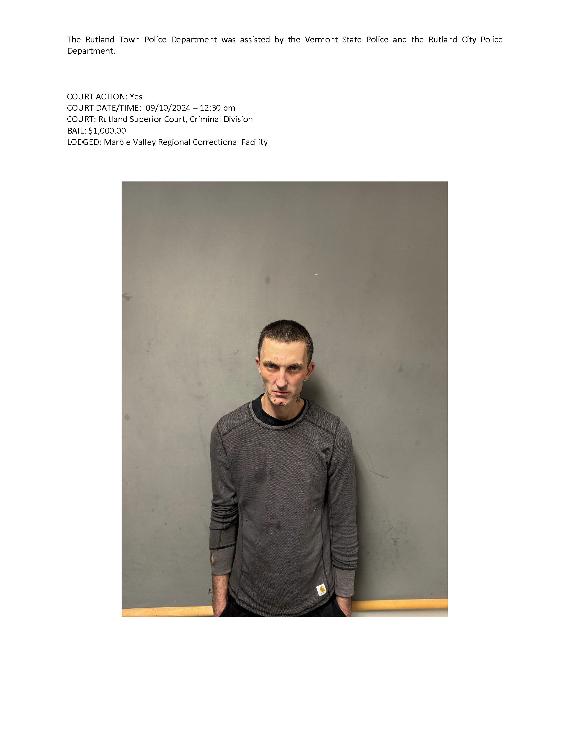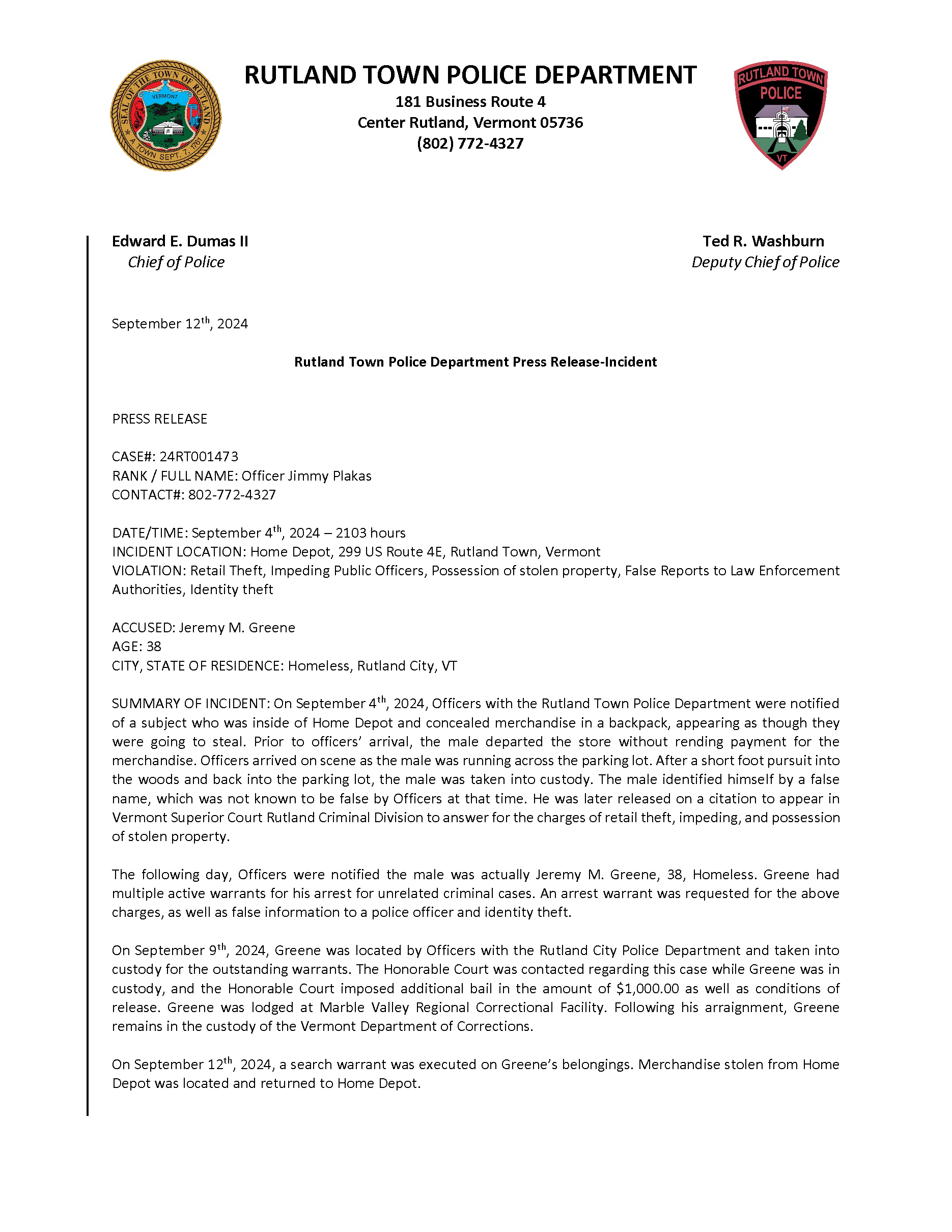 Rutland Town Police Department September 2024 Press Releases