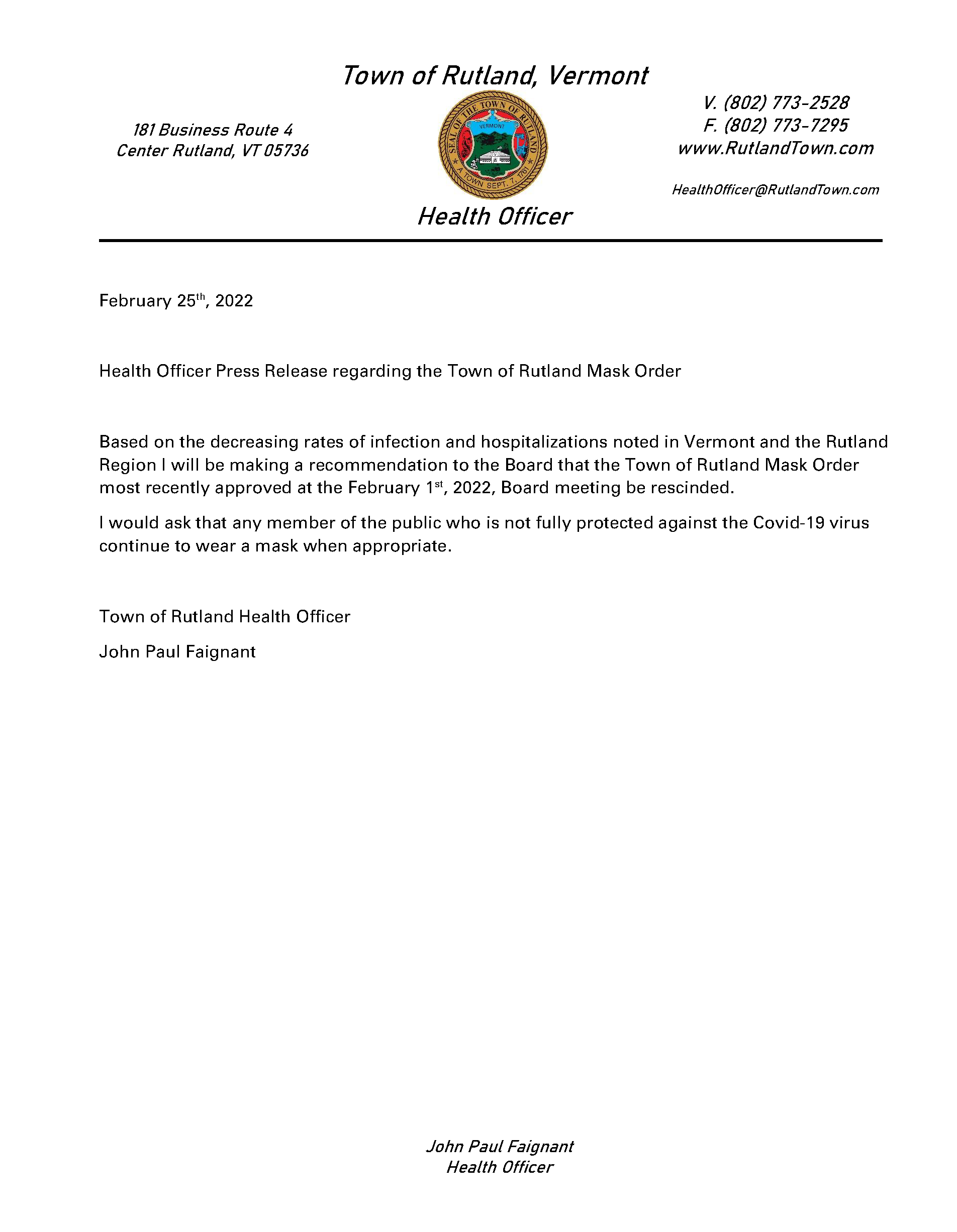 Town Health Officer Mask Order Update